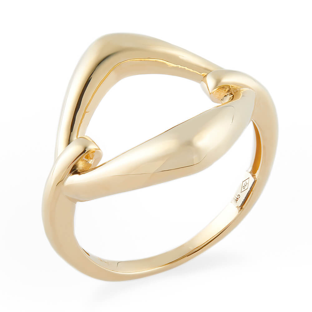 La estructura, formada por un óvalo irregular que se pliega sobre sí mismo, crea un juego de espacios vacíos y volúmenes pulidos que permiten que la luz atraviese la pieza y la haga brillar desde distintos ángulos. Es una sortija que respira: no encierra, sino que acompaña. Su forma libre aporta dinamismo y una sensación de fluidez casi escultórica.
