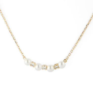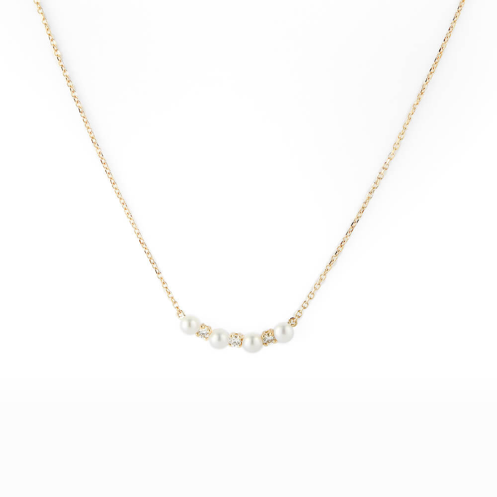 La disposición lineal del diseño crea un equilibrio natural, casi musical. Las perlas marcan el ritmo, los diamantes introducen la pausa luminosa, y el oro actúa como un hilo cálido que da continuidad a ese pequeño paisaje de claridad. Es una pieza pensada para acompañar el escote con discreción, dejando que la luz se apoye en ella sin sobresaltos.