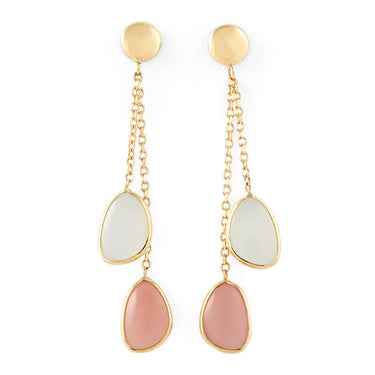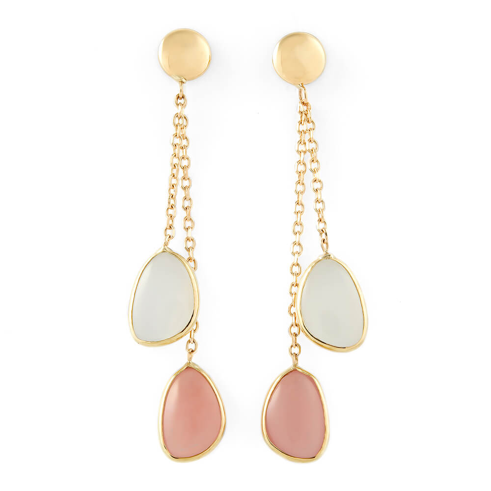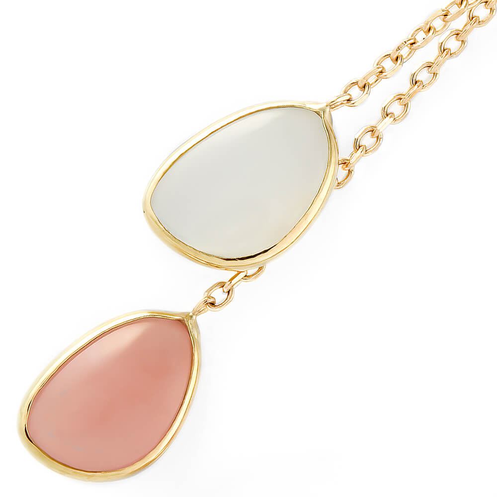 En la parte superior, un óvalo de oro pulido aporta un punto de luz cálida y sirve como anclaje para las dos caídas. La primera gema, ágata en tono blanco perlado, ofrece un brillo suave, casi lechoso, que recuerda a la claridad de un día nublado. Debajo, un cabujón de cuarzo rosa introduce un toque de calidez y serenidad, como un susurro de color sobre la piel.