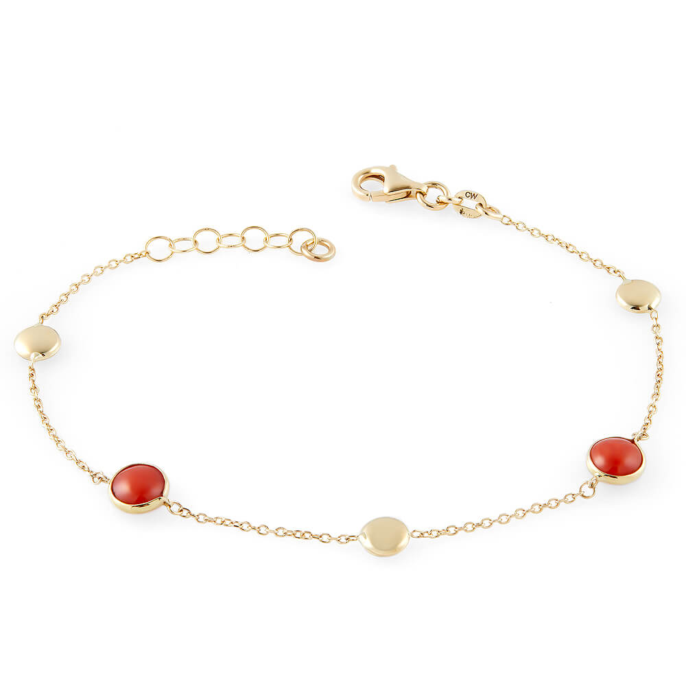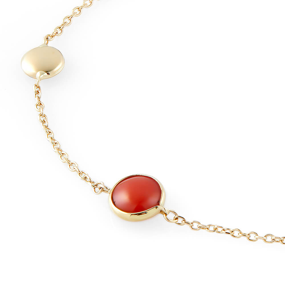 Esta pulsera forma parte de Brisa carmesí, una colección que recoge la calidez del coral y la convierte en un gesto suave sobre la piel. Realizada en oro amarillo, alterna pequeñas esferas pulidas con cabujones de coral que aportan un toque vibrante y luminoso.